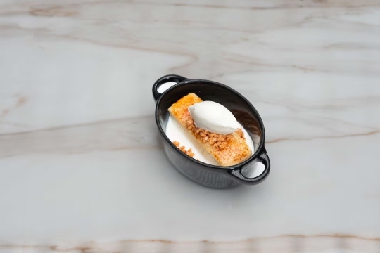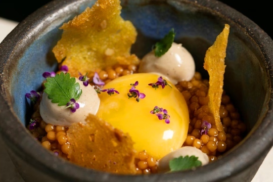 - Yema de huevo de caserío sobre estofado de trigo: Estofado de trigo, yema de huevo de caserío y crocante de maíz.
