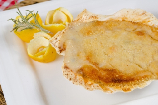 - Vieira rellena de langostinos con ensalada tropical.