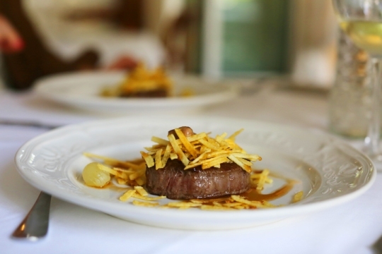 - Taco de solomillo de vaca con teja de hongos y patatas Baby aromáticas.