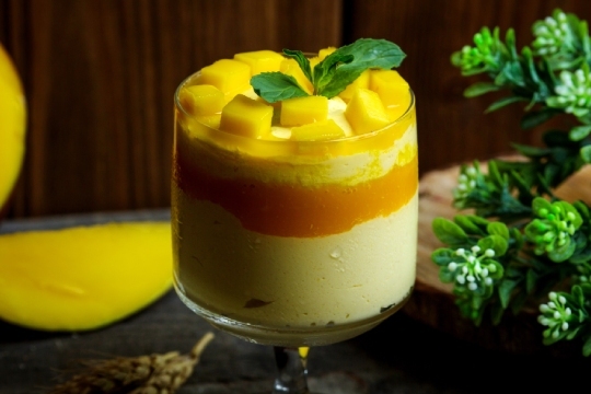 - Mousse de mango sobre natilla ligera.
