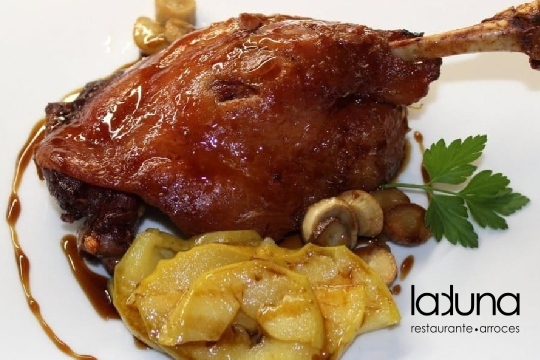 - Muslo de pato en confit con puré de manzana asada y baño de Oporto.