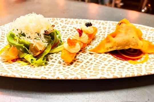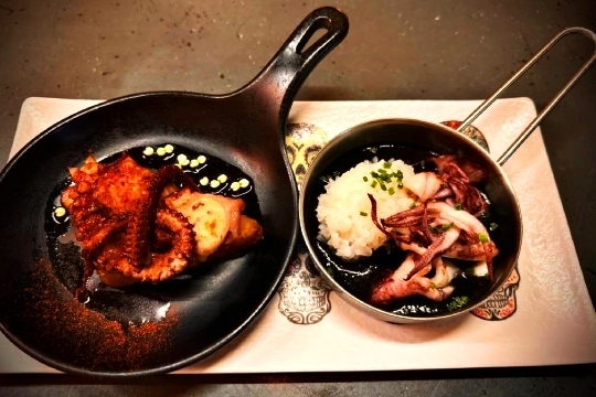 - Taquitos de bacalao, cebolla caramelizada y salsa de tinta.