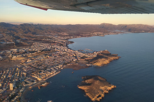 Despegamos rumbo al Mar Mediterráneo, hacia el pueblo costero de Mazarrón. Sobrevolarás las playas que se alternan con invernaderos de tomates por toda la zona. Recorreremos kilómetros de costa virgen hasta llegar a Cabo Cope, donde empezaremos a visualizar el pueblo de Águilas y sus bonitas islas y calas. De vuelta a nuestro aeródromo, sobrevolaremos una singular urbanización ¡con pista de aterrizaje propia! ¡El sueño de cualquier aviador!